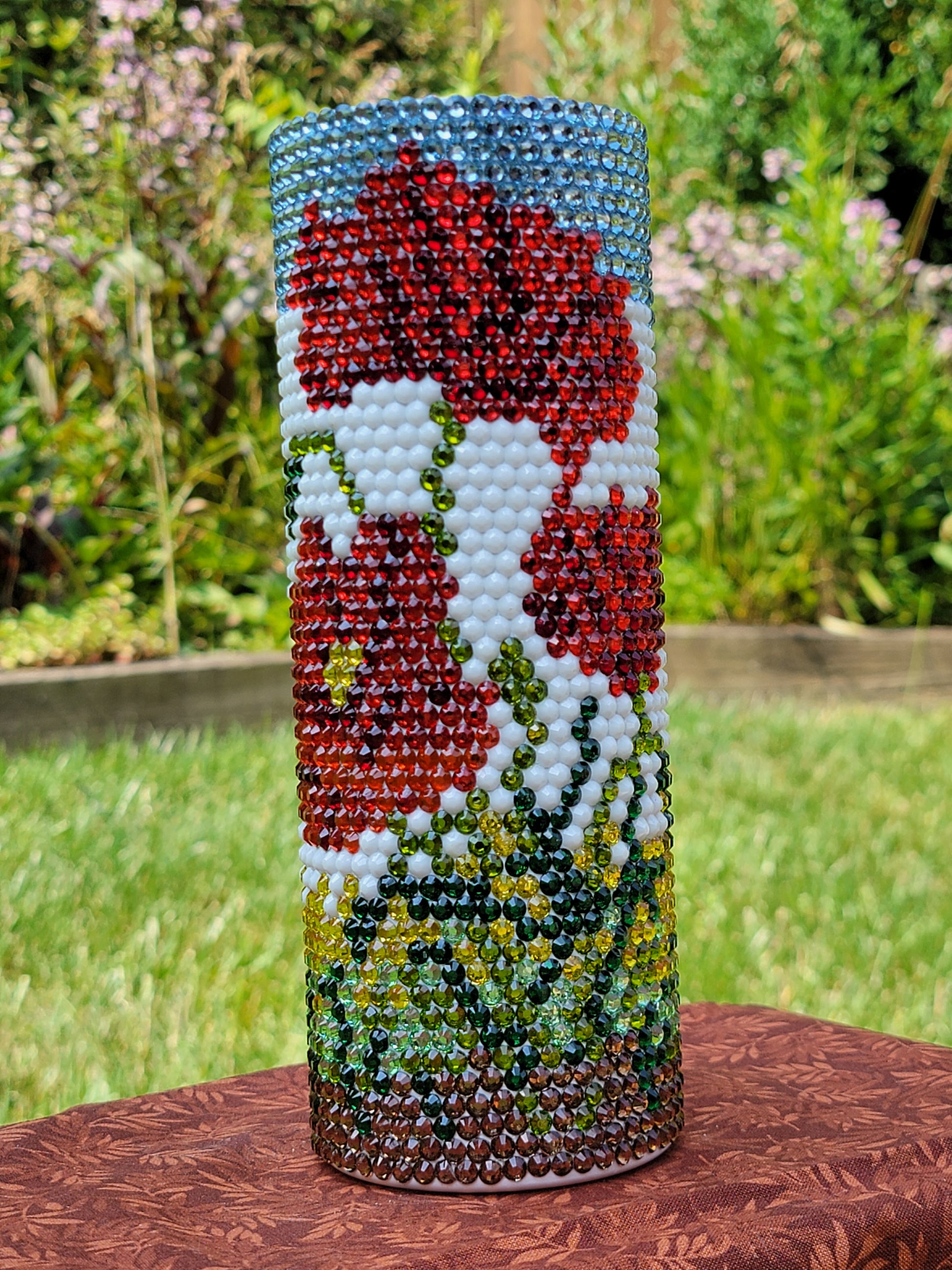 20oz stainless steel insulated tumbler. Resin rhinestones. 1 is available, but more can be made.
